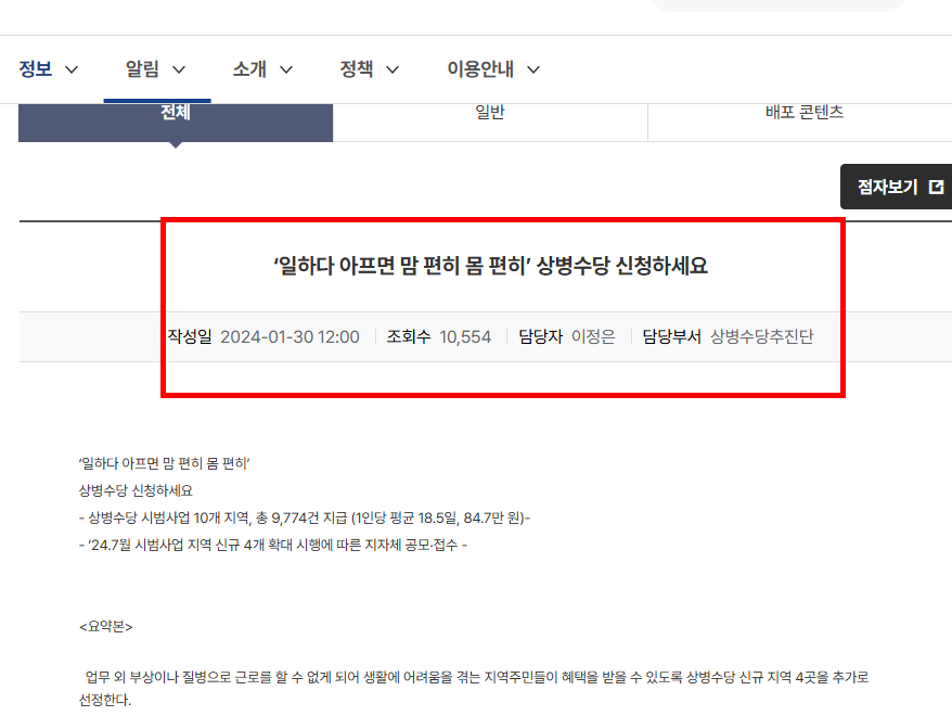보건복지부 위의 링크를 클릭하면 보건복지부의 상병수당 관련 안내 페이지로 이동하게 됩니다. 해당 페이지에서는 상병수당 제도의 개요부터 신청 조건, 필요 서류, 절차에 대한 자세한 설명이 잘 정리되어 있어, 처음 접하는 분들도 쉽게 이해할 수 있습니다. 페이지에 접속하면 우선 상병수당이 어떤 제도인지 간략하게 소개되어 있습니다.