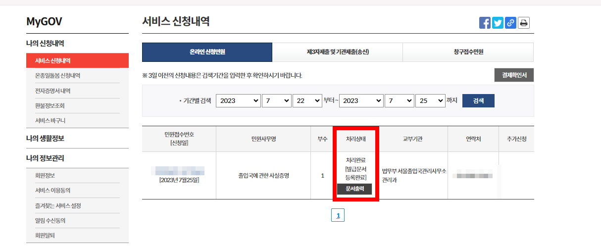 ▶ 발급하는데 30초에서 1분가량정도 기다려주셔야 하며 신청이 완료되면 아래 사진과 같이 처리상태가 완료라고 뜨면서 문서를 출력할 수 있게끔 나옵니다. 문서출력 버튼을 눌러주시면 되겠습니다. 오른쪽 상단에 인쇄버튼을 눌러서 최종적으로 발급을 마무리해 주시면 되겠습니다.